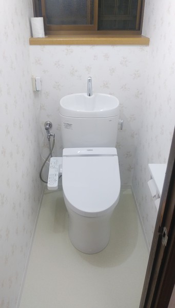 今回は節水機能が優秀なピュアレストEXを採用しました。超節水機能の他、工夫された形状で掃除が簡単。清潔さを保ちやすいトイレで人気の組み合わせトイレです。便座はSBシリーズのスタンダードタイプのウォシュレットをご選定頂きました。多彩な洗い心地に大満足です。紙巻器の交換をしクロスとクッションフロアも張替え、明るく清潔感のある空間に仕上がりました。