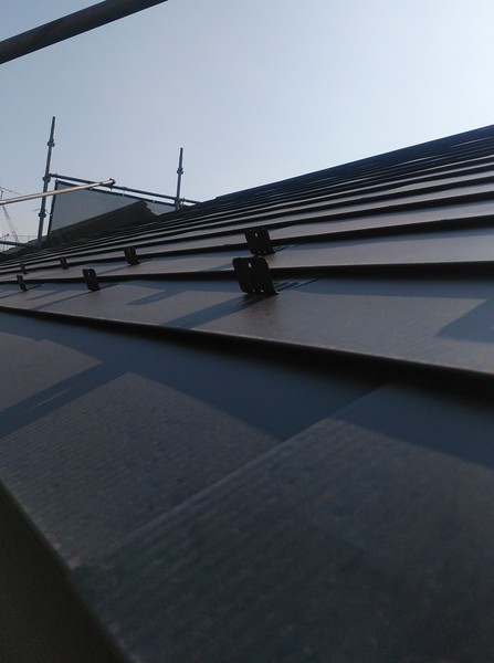 軽量で高い耐久性の上湿気や水に強い金属屋根(ガルバ鋼板)を平葺にて葺き上げました。雪止めを取付けています。