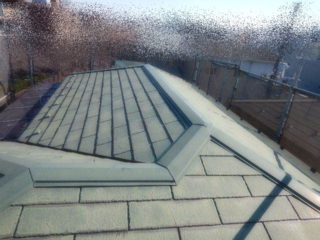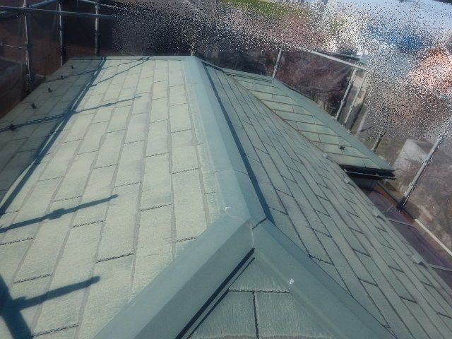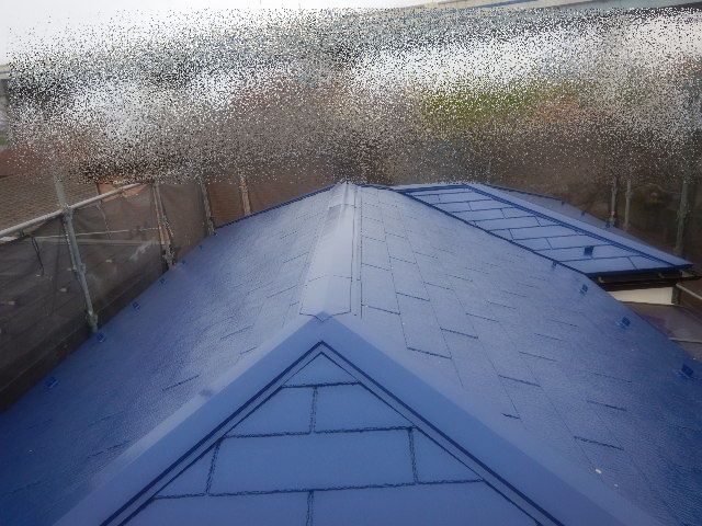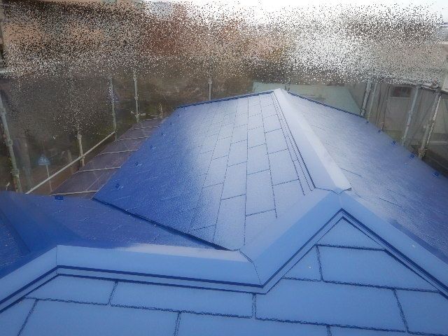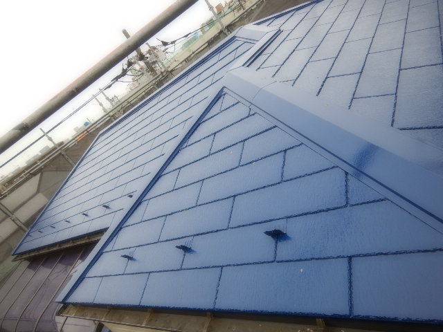高圧洗浄汚れを洗い流し最後の層まで丁寧に仕上げました。エスケー化研のヤネフレッシュSi(弱溶剤)のタイプでしっかりと3回塗りました。色はRC-116(ウルトラマリーン)という濃い青色になります。