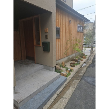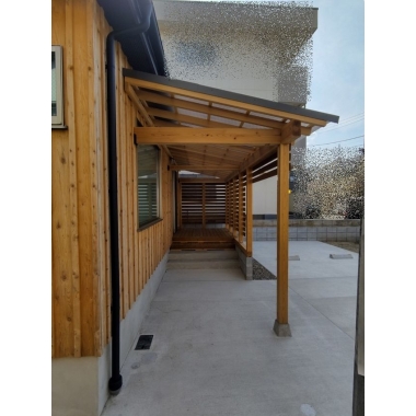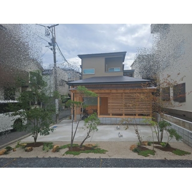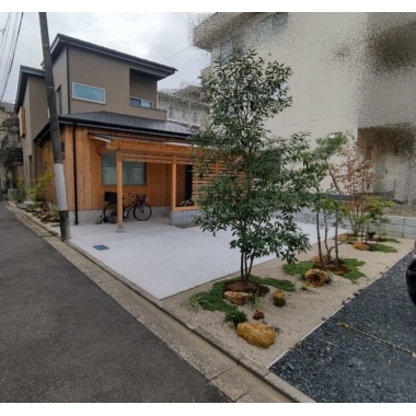 - 新築の外構工事をいたしました。駐車スペースは車1台分は土間コンクリートを打設し、貸駐車場2台用に砂利を設置しました。駐車スペースの間には植栽を配置し全体が自然の優しい印象に包まれた空間に仕上がりました。キッチン奥のパントリー掃き出し窓にはウッドデッキを設置しました。 車までの動線が短くウッドデッキからパントリーへ重い荷物を運び入れる手間が少なく済む上、食料品を冷蔵庫へ収納するのもスムーズにできます。 また、外から荷物を運び入れるだけでなく、ゴミ捨ての際も勝手口が便利です。日よけに加え、目隠しフェンスを取り付けることで、プライバシーに配慮した居心地のよい空間にしました。